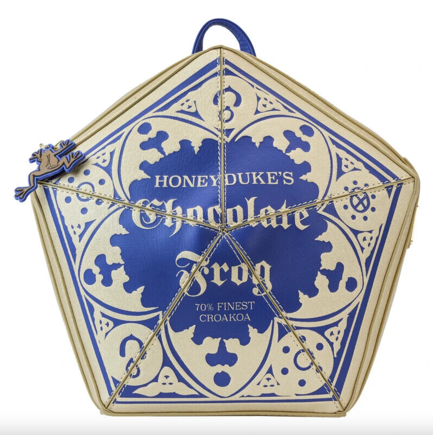 Board the Hogwarts Express™ in style with our Harry Potter™ Honeydukes™ Chocolate Frog Figural Backpack. This enchanting backpack takes on the characteristic geometrical shape of the Honeydukes Chocolate Frog box. On the front, you’ll find intricate designs, in metallic gold, of the Honeydukes logo. The center even comes to a point in the box’s characteristic style. The words “70% Finest Croakoa” add an authentic touch, and the bag is chocolate-scented! A silicone zipper charm of a chocolate frog completes the look. On the back, the chocolate frog makes an encore appearance. There’s plenty of room for your daily essentials—as well as a few sweet treats. Wherever you go, have fun making the sweetest of memories when you carry this accessory along.